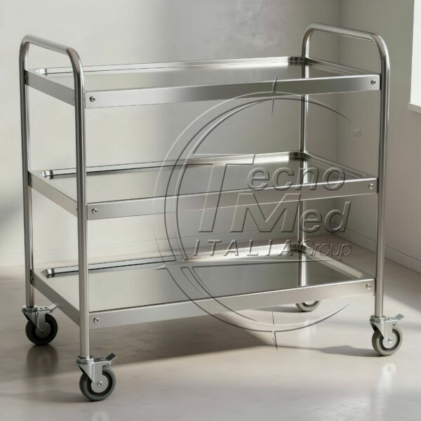 The stainless-steel medical service trolley with three shelves is designed to provide efficient organisation and hygienic handling of instruments and materials in dental clinics, hospitals and operating-theatre environments.