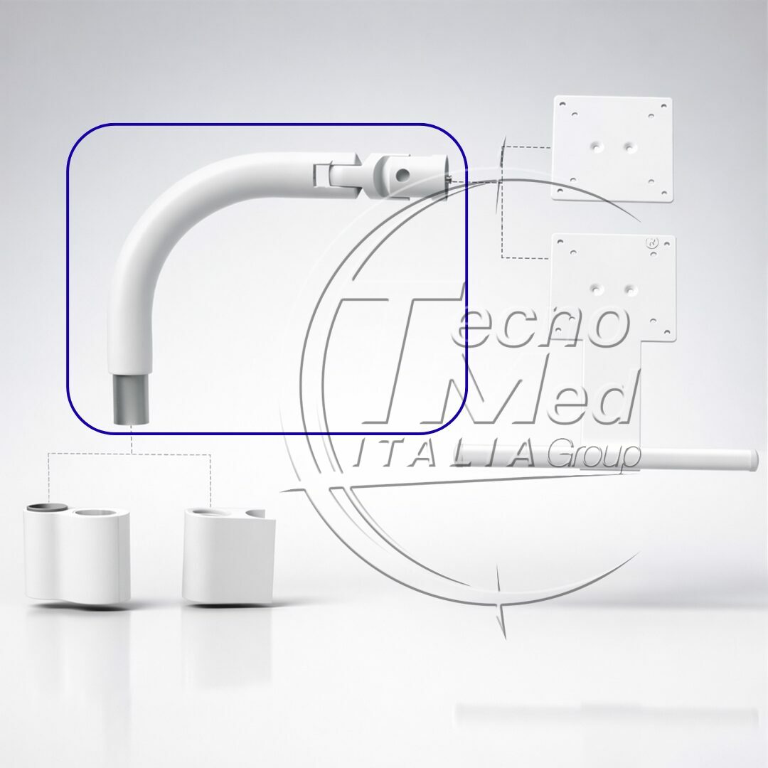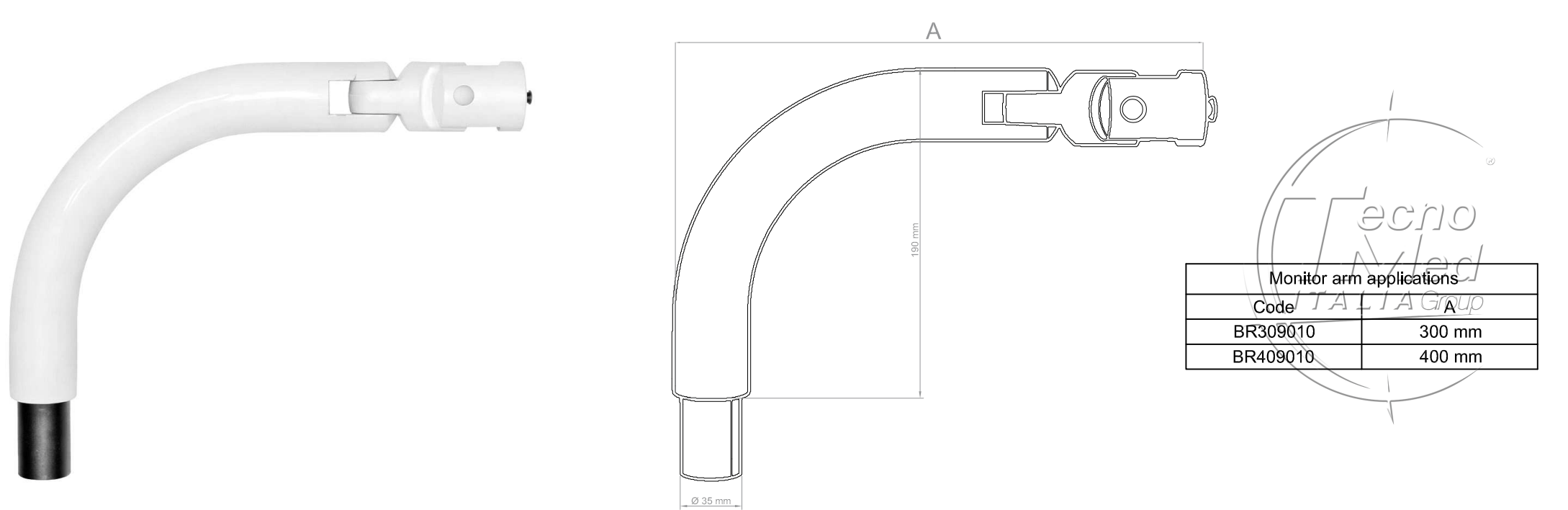 Monitor support arm for dental unit application, with joint and 35mm spigot, 400mm length.