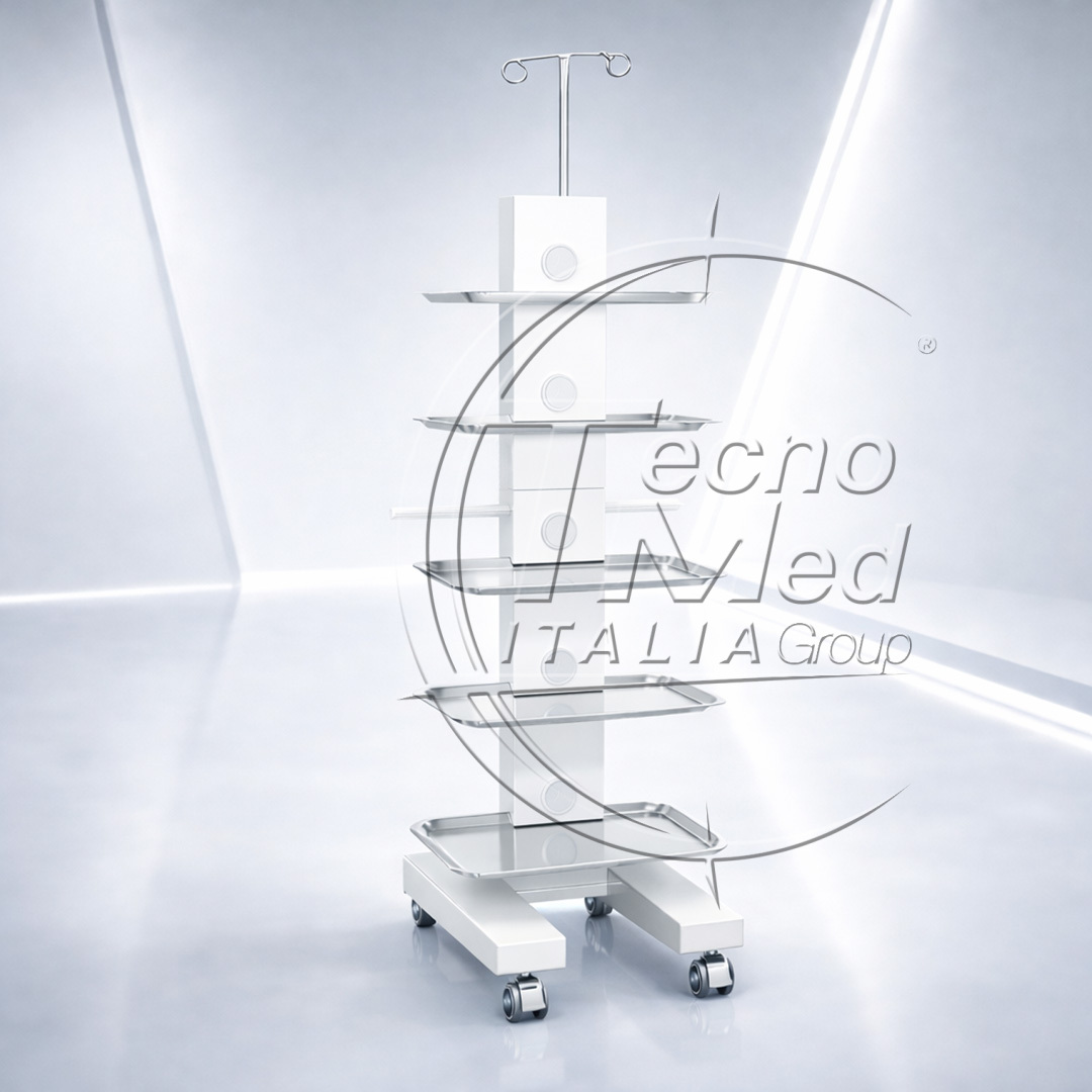 Designed for dental practices, outpatient clinics, operating theatres and hospital environments, the 5-tray configuration with integrated height-adjustable IV pole provides a fully equipped mobile workstation capable of supporting multiple devices and instruments during clinical procedures.