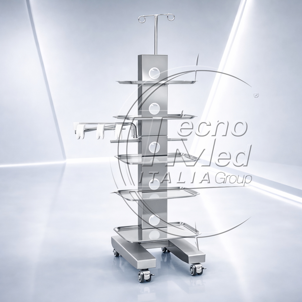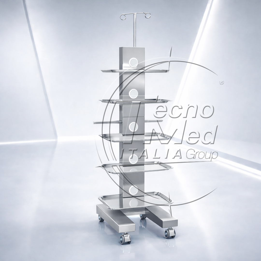 The removable, sterilizable trays allow clear and intuitive instrument management, improving ergonomics and workflow efficiency. Thanks to the integrated power system, equipment can be powered directly on the trolley, reducing cable clutter and increasing operational safety.
