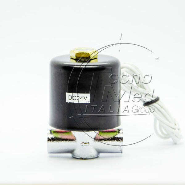 24VDC water solenoid valve, 2-way normally closed, brass body, inline fitting for 4x6mm tube. Designed for dental unit water systems.