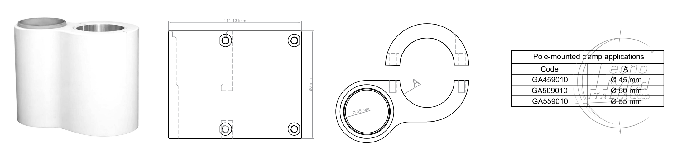 The fixing clamp for 45mm medical pole can be combined with Tecnomed monitor arms or equivalent monitor arms featuring a Ø35mm spigot.
