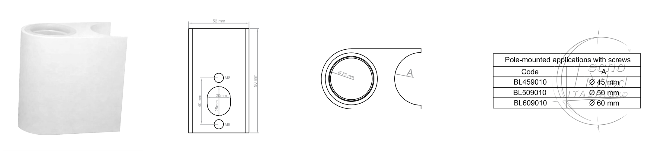 BL609010: blocchetto di fissaggio per braccio porta monitor su palo di diametro 60mm.