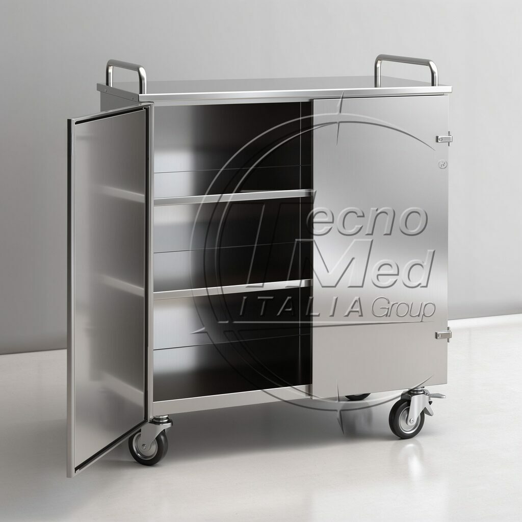 Il carrello armadio portacontainer in inox rappresenta una soluzione ergonomica e affidabile per reparti di sterilizzazione, sale operatorie, laboratori e cliniche che richiedono arredi professionali in acciaio inox di lunga durata e facile manutenzione.