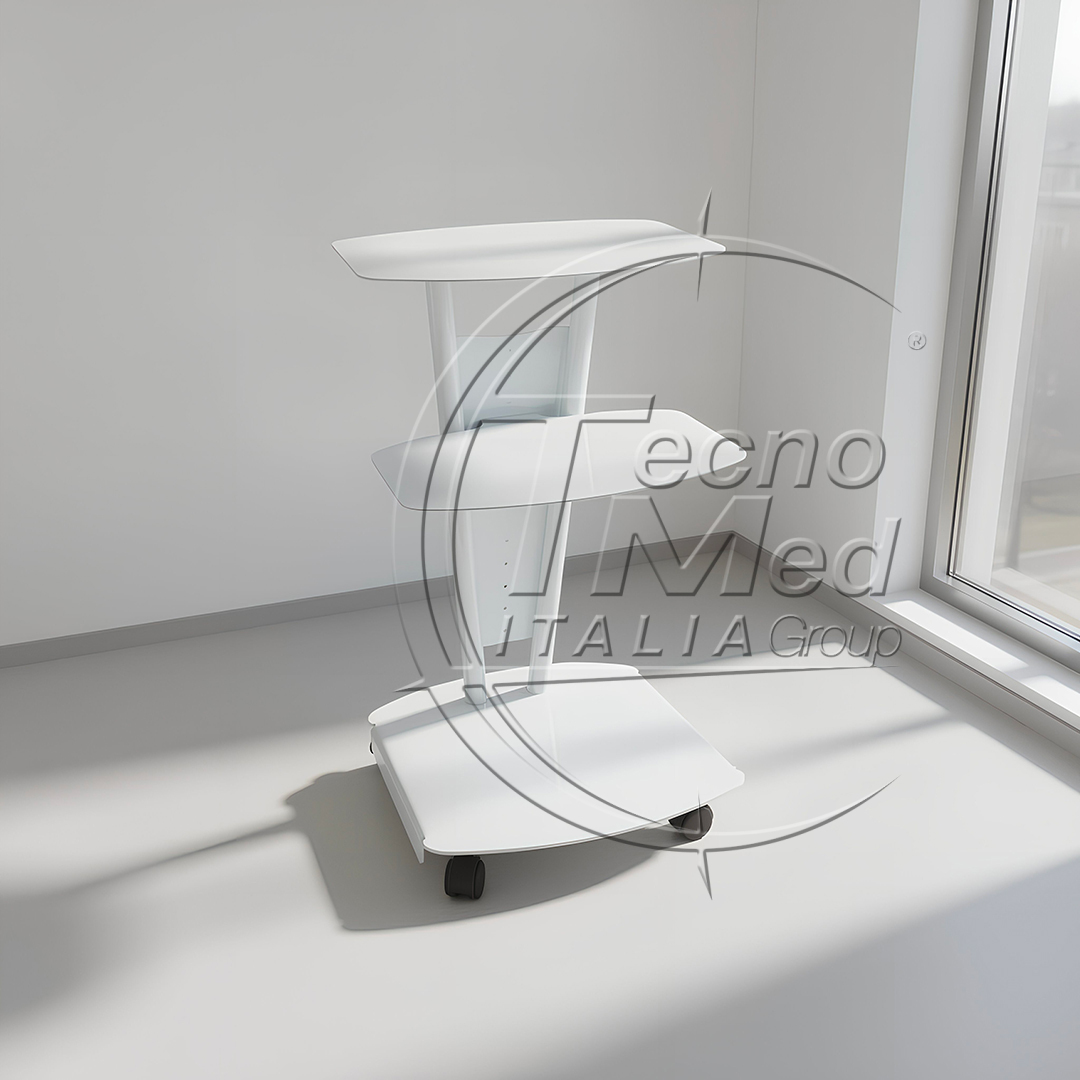 Le ruote garantiscono un movimento fluido e silenzioso, rendendo il carrello facile da spostare anche in spazi ristretti. Il design bianco soft, elegante e pulito, si integra armoniosamente in qualsiasi ambiente professionale.