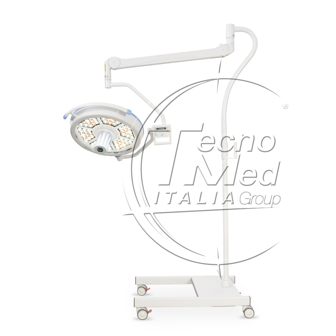 Lampada scialitica chirurgica LED con illuminazione fino a 140.000 lux montata su stativo mobile con ruote. Luce uniforme con CRI >95 e profondità fino a 1300 mm. Disponibile con telecamera integrata per documentazione e formazione clinica.