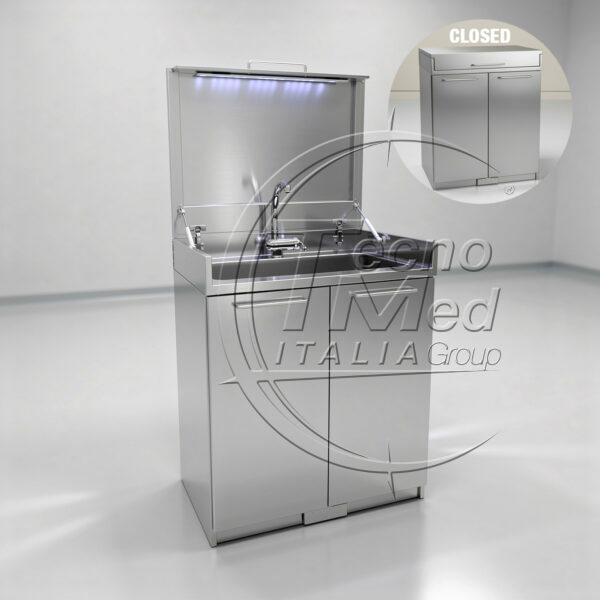 Il design a scomparsa rende il lavabo una soluzione funzionale per gli spazi in cui è necessario integrare attrezzature chirurgiche senza compromettere accessibilità, igiene e organizzazione del layout.