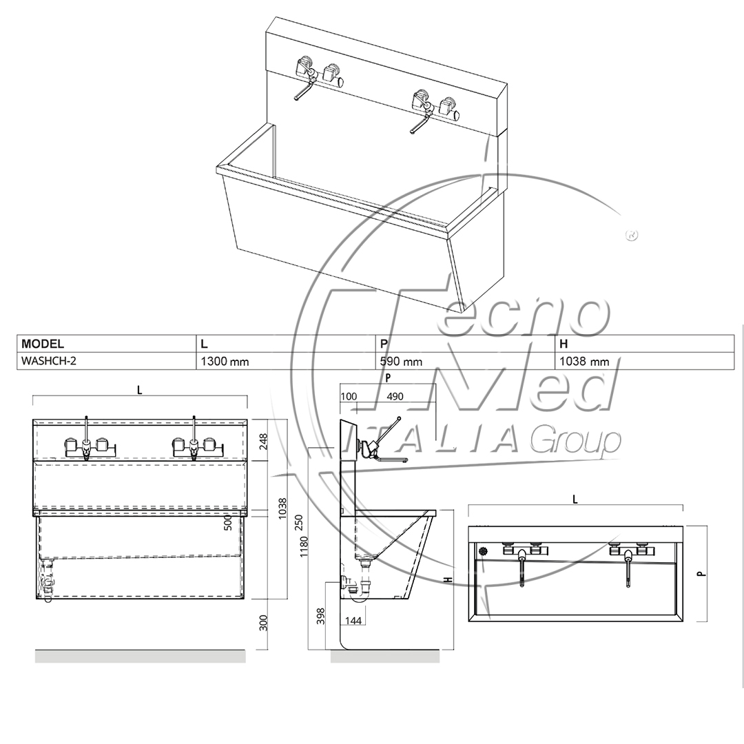 Lavabo chirurgico da parete a postazione doppia, realizzato in acciaio inox AISI 304 satinato Scotch Brite, spessore 1,5 mm.