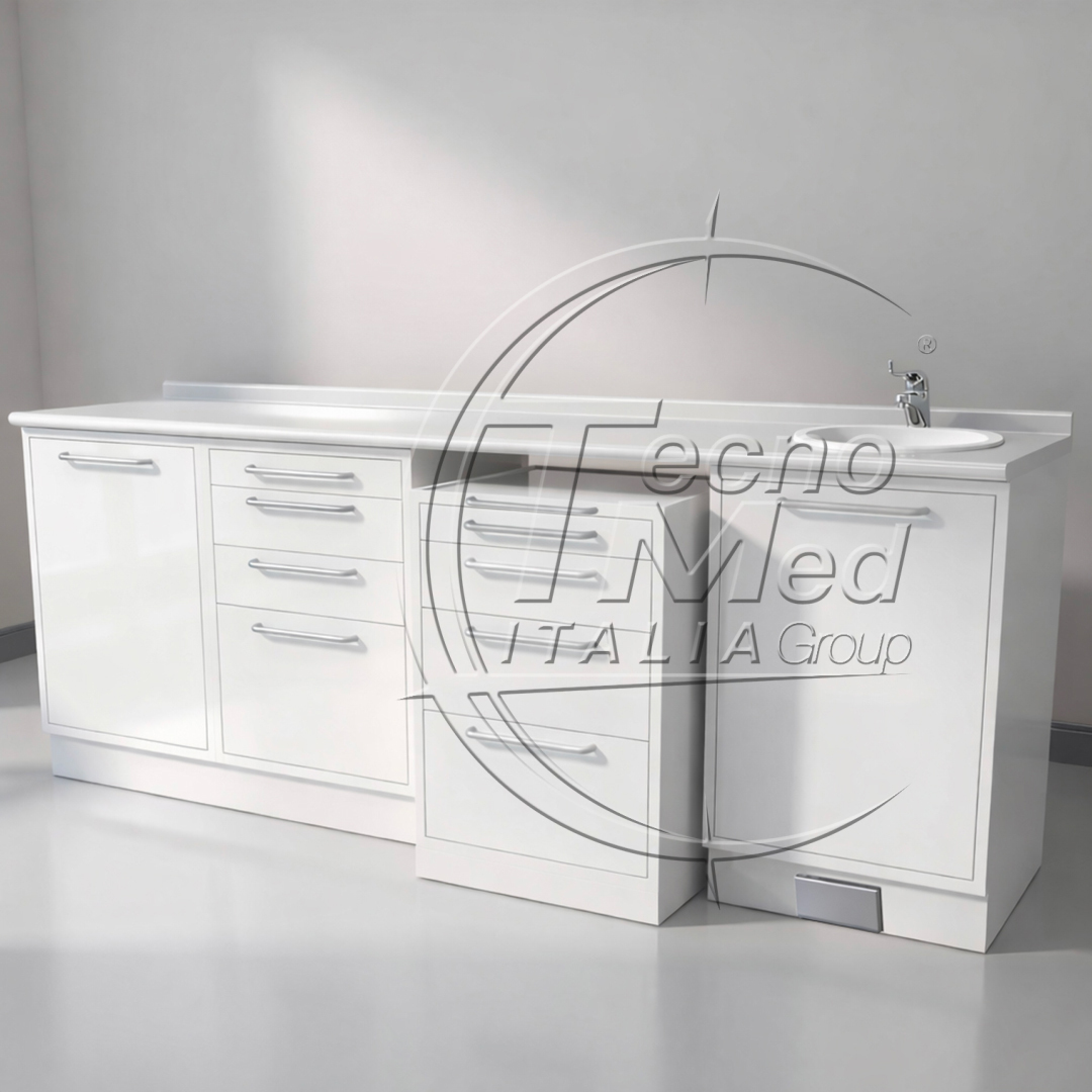 Il mobile da studio con elettrovalvola e lavello a destra, top da 50 cm, è una soluzione professionale pensata per studi odontoiatrici, ambulatori medici, veterinari e centri estetici.