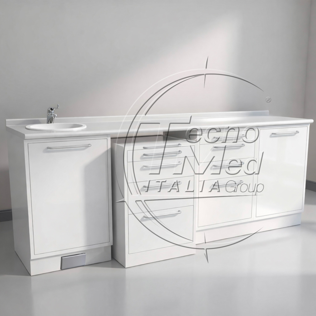 Questo mobile da studio con elettrovalvola e lavello a sinistra è la soluzione ideale per chi desidera un arredo professionale, igienico e progettato per migliorare il flusso di lavoro quotidiano.