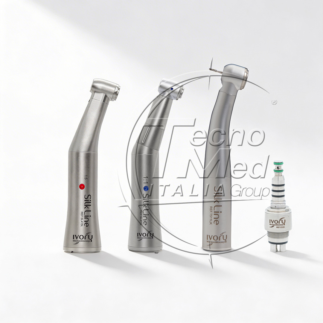 Kit professionale Ivory Silk Line è la soluzione completa per odontoiatria che integra turbina fibrata compatibile KaVo ®, contrangoli 1:5 e 1:1 e attacco rapido Multiflex® per prestazioni affidabili nella pratica quotidiana.
