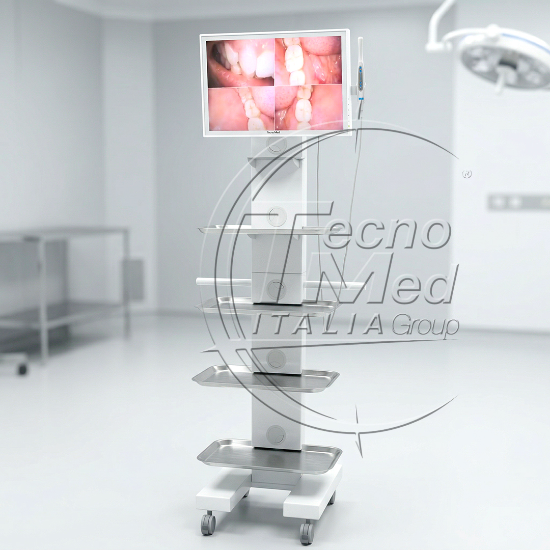 Tutti i componenti sono installati su carrello Easy Tray inox bianco elettrificato, dotato di supporto monitor e progettato per offrire stabilità, igiene e facilità di movimentazione tra le diverse postazioni operative dello studio.