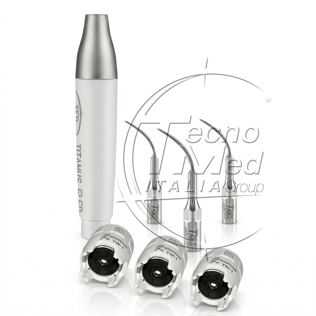 Kit manipolo ablatore TKD Titanus ELED con luce LED integrata compatibile con ablatori KaVo PiezoLED, comprensivo di 3 inserti scaling tipo KaVo PiezoLED 201 e 3 chiavi dinamometriche stringipunte.